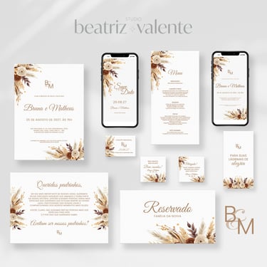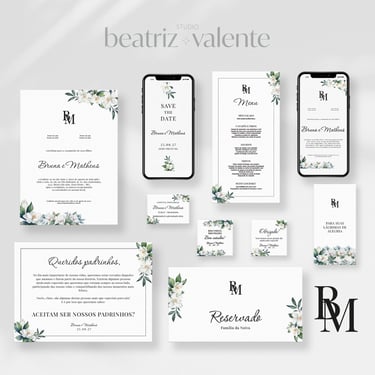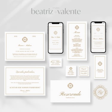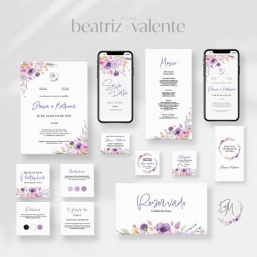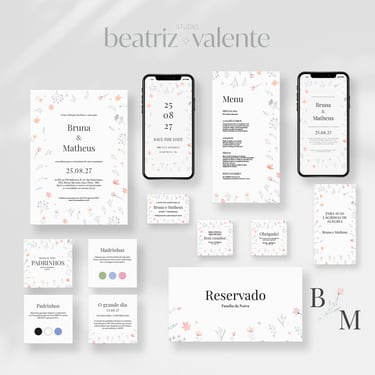 convites, papelaria e peças digitais seguem o mesmo padrão visual.